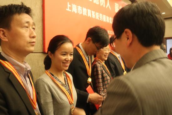 5月3日下午,由上海市教卫工作党委和上海市教委主办,上海市教育工会和上海市劳模协会承办的以“立德树人薪火相传”为主题的教育系统劳模和优秀教师座谈会暨先进表彰会在上海交通大学医学院懿德楼隆重举行。本次表彰中,上海教育系统共有10家单位被授予全国和上海市五一劳动奖状称号、27名同志被授予全国和上海市五一劳动奖章称号、7个班组(团队)被授予全国和上海市工人先锋号称号。我校语言文化学院院长助理黄蔚老师摘得上海市“五一劳动奖章”。