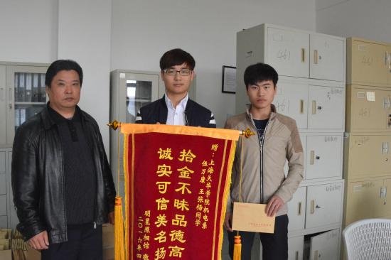 2016年4月11日,我校工学院收到市民朱明星送来“拾金不昧品德高、诚实可信美名扬”的锦旗,这面锦旗是感谢我校2015级机电1班伍万康、王张扬2位同学的拾金不昧,同时也对我校德育教育工作表示认可以及感谢。