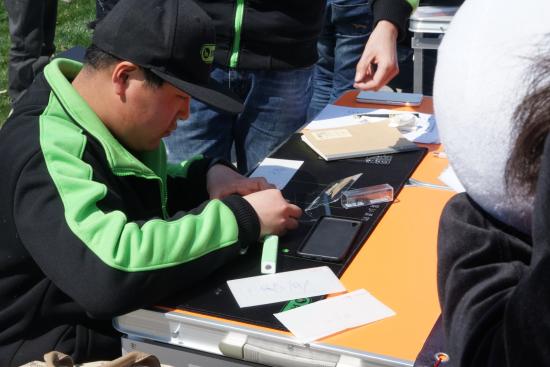 杨柳依依,天华的小桥边,摆起了一个又一个桌子,身着绿色工作服的手机工程师和志愿者们,为路过需要手机贴膜和修理的同学提供免费的服务。金色的阳光洒在他们脸上,把工作人员们额头上渗出的汗珠照耀得晶莹剔透,工作人员们认真的表情,细心的工作,配以志愿者们的热情,使春季的天华校园,显得更加美丽动人,生机勃勃。同学们拿着手中刚刚贴好膜的手机,感受着手上沉甸甸的分量,心里是暖洋洋的温度。