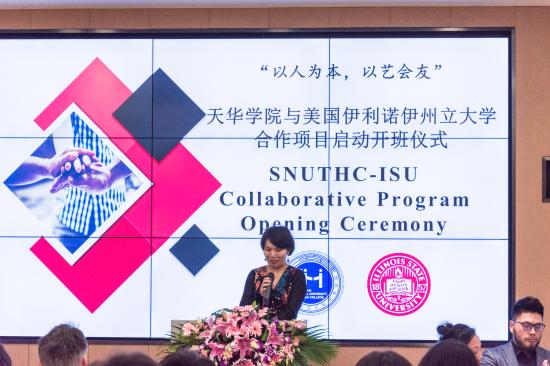 来自大西洋彼岸的美国伊利诺伊州大学的校长Larry Dietz携夫人、分管教学副校长Jonathan Rosenthal,艺术学院院长Jean Miller,艺术系主任Mike Wille,国际交流处副处长Yimin Wang及五位即将来天华集中授课的教师一行11人出席并参加了开班仪式;我校校长叶才福,国际交流处处长胡珍,艺术设计学院院长王大根,副院长朱花、徐子卿、艺术学院院长助理包臻隽及国际交流处、艺术设计学院教师代表以及此次合作项目的学生们出席并参加了开班仪式。开班仪式由胡珍老师主持。