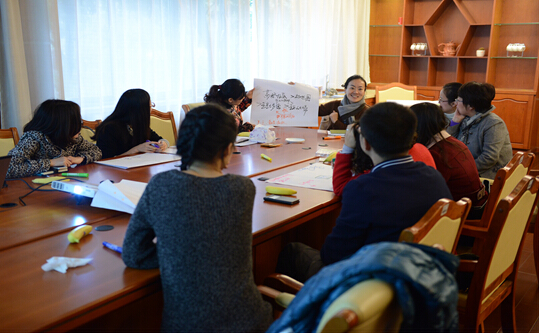 接着,我校教学名师黄蔚老师就如何组织课堂教学与大家进行了深入探讨。黄蔚老师是我校教学明星,在上海市高校各类青年教师讲课比赛中屡获大奖,有着丰富的实战教学经验。黄蔚老师首先抛出GPS(Gains, Praises, Suggestions)这一专业术语,GPS指教师写教学反思和教师互评的时候涉及到的几个方面。然后,黄蔚老师组织了两个生动有趣、并富有教育意义的小组活动。第一个小组活动是“教师心目中理想的师生关系”,活动为两人一组,要求每一组教师通过在纸张上画图的方式,描述自己心目中理想的师生关系。每一小组都从不同的角度对此进行了阐述,如良师益友、教学相长、协助者等。分享与讨论过后,黄蔚老师引发大家思考这样一个问题,是否教师对师生关系的理解会直接影响教学设计、活动组织和教学效果?