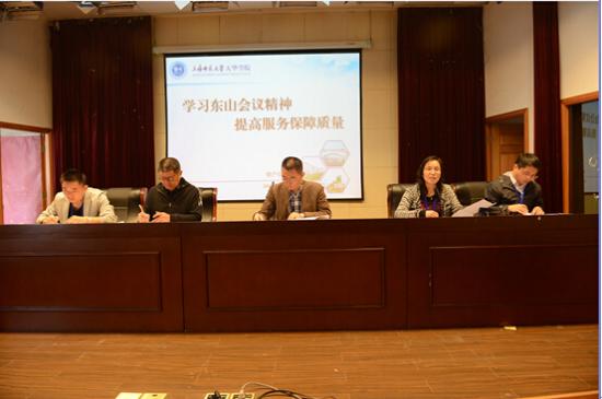 2015年11月2日中午12:10,资产设备处在明华楼报告厅组织召开了主题为“学习东山会议精神,提高服务保障质量”大会。资产设备处处长朱清,副处长董海霞、周建文,图书馆馆长吴志荣,网络中心主任许晓洁及资产设备处全体员工参加了大会,会议由资产设备处副处长董海霞主持。