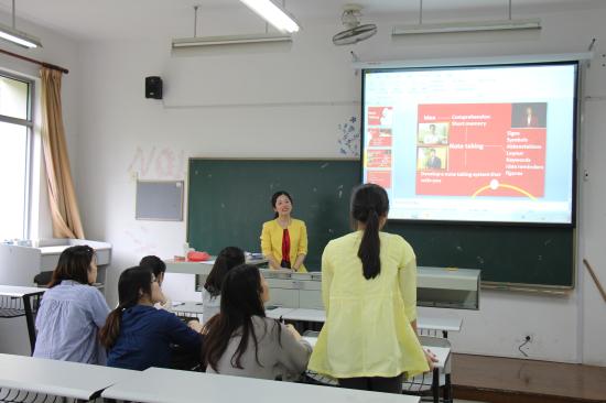 (胡雅楠老师在“口译理论与实践”翻转课堂上和学生互动)