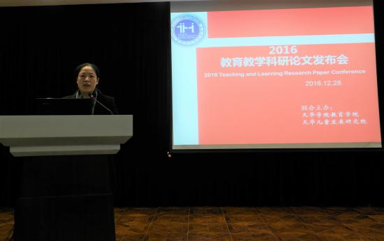 2016年12月28日,我校教育学院与天华儿童发展研究院联合主办的“2016教育教学科研论文发布会”在图书馆四楼多媒体报告厅举行。会议由教育学院副院长、儿童教育发展研究院副院长徐娟主持。副校长陈新斌、龚春蕾,党委副书记许岳,教育学院、儿童教育发展研究院院长滕薇,科研处处长翁跃明,质量管理处夏明烨教授,教育学院特聘指导专家惠中教授,以及来自教育学院、儿童教育发展研究院、语言文化学院、健康学院和管理学院的领导和老师共计50余人参加了当天的活动。