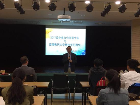 (美国西俄勒冈大学分管国际交流的副校长Neng Yang介绍学校情况)