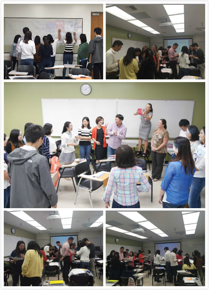 加州州立大学富乐敦分校教育学院为来自上海的16名青年教师安排了Student Centered Teaching/Learning、Universal Design for Learning、High Impact Practices等教学方法类课程。在Student Centered Teaching/Learning课程中,授课教师提出活力课堂教学中应体现4C’s,即批判性思维、创新、合作与沟通(Critical Thinking, Creativity & Innovation, Collaboration, Communication)。同时在几周的学习过程中介绍了许多提高学生参与度的教学方法,如Walk-Around Survey、Jig Saw、Think/Pair/Share、Carousel Strategy、True/False Sort、Quick Scans、Quick Write、Quick Draw、Graffiti Board等方法,并分别从课程导入、课程主体和课程总结几部分演示如何来组织一节有活力的课堂。授课教师在讲解的同时带领学员们一起参与到各教学方法的实施中,手把手教授大家运用这些教学方法,并引导学员们思考如何将这些教学方法应用到自己的课程中。