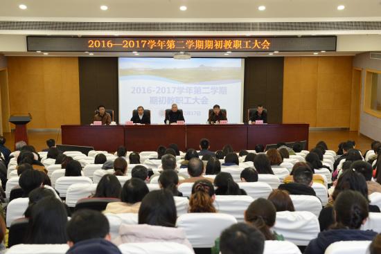 金猴翘首辞旧岁,雄鸡报晓迎新春。2017年2月17日上午9:00,学校在晖华楼报告厅召开了2016—2017学年第二学期期初教职工大会,董事长邹荣祥、执行董事长石伟平、校长叶才福、总校监郭伟奇、特别顾问陆建非在主席台就坐,校务委员会全体成员及教职工近300人出席会议。会议由石伟平执行董事长主持。