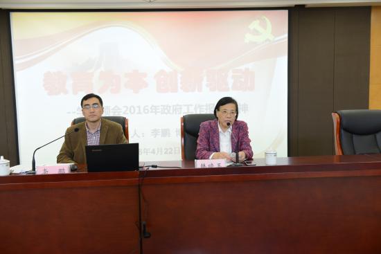 2016年4月22日下午,党委举办党员学习报告会,“教育为本,创新驱动——学习领会2016年政府工作报告精神”讲座在晖华楼报告厅隆重举行,讲座由中国浦东干部学院李鹏博士主讲,党委书记韩晓玉主持,全校300余师生党员聆听。