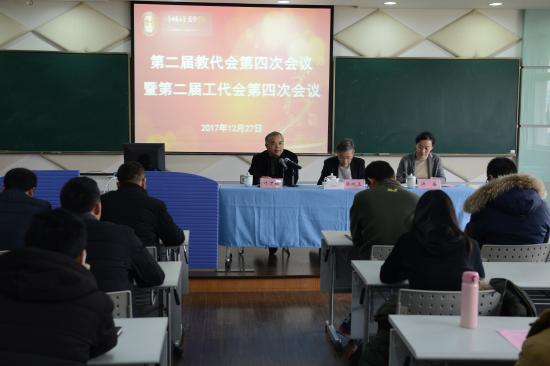 12月27下午,学校工会在明华楼演播中心召开了第二届教代会第四次会议暨第二届工代会第四次会议。会议主要议题为:听取学校工作报告,审议行政教辅人员重点性调资方案。教代会代表共52人出席了会议,会议由党委副书记、工会主席许岳主持。
