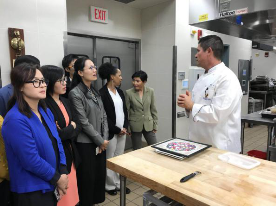 Cerritos社区大学成立于1955年,是一所美国的公立综合社区学院。学校旨在培养来自世界各地的学生,海外学生占60%,此外,还开设如双语项目以及学院荣誉项目等特殊课程。如双语项目、周末学院、希望工程、学者荣誉项目等等。该校还有些特别的学术项目。学校开设的专业涉及近90个领域,招收生源每年近1300人,为了保证学生顺利完成学业,学校为学生提供各种充足的奖助学金,开设的专业包括:商业教育、体育、健康、自由艺术、在线课程等,课程设置更多偏应用型。校董事成员Dr. Liu专门带研修团参观了校园的特色部分,包括Reggio Emilia儿童教育发展中心,学生语言学习中心,学生会例会、特色烹饪专业等等。该校的儿童教育发展中心引入了意大利Reggio Emilia(瑞吉欧)教育理念, 以尊重,责任和社会性的原则为基础,通过在有支持和丰富的环境中探索和发现,以儿童的兴趣为基础,通过自我指导的课程来实施。这跟我们天华学院学前教育课程很匹配。这里的学生语言学习中心向非母语学生提供语言类课程,帮助他们提高英语水平,顺利通过语言考试。Cerritos社区大学的语言类课程更接近我们天华学院英语类课程的设置和授课风格。研修团有幸观摩了几个课堂教学。教师以学生为中心、强调合作学习的教学方式对天华学院的两位英语教师很有启发。