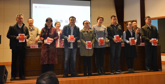 随后,举行了向基层党组织赠送学习资料仪式。学校八个党总支书记上台领取了新党章和习近平总书记在十九大上的报告等学习材料。