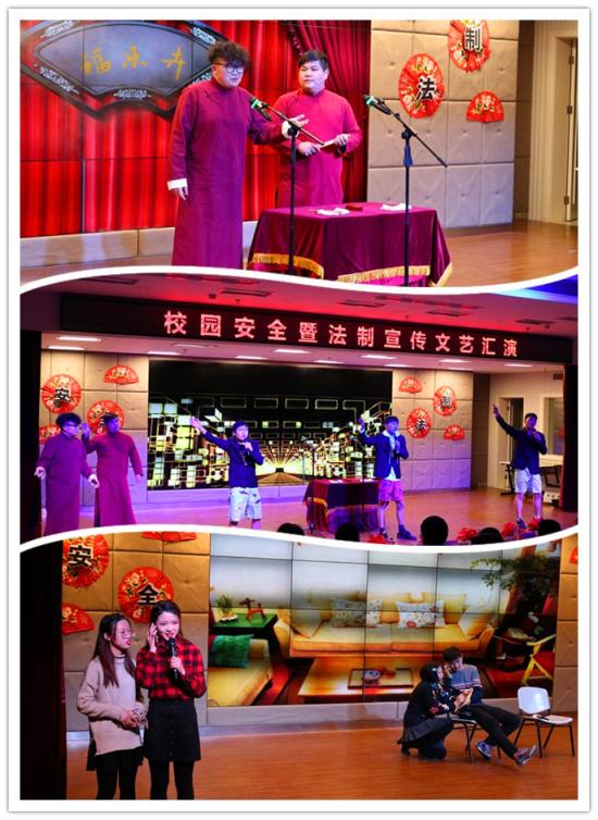 由语言文化院带来的情景喜剧《寝室的故事》,描述了学生宿舍内违规使用大功率电器产生的火灾危害,让同学们意识到集体宿舍楼安全用电的必要性;健康学院带来相声《危险苹果乐园time》,说安全,话安全,让师生在欢乐中寓教于乐;教育学院带来的小品《就是要打到你关机》带来很多新型的诈骗方式,让师生们提高防范意识,掌握防范技巧;管理学院带来小品《安全演习》演译了现实生活中诸多诈骗方式让人们防不胜防,培养安全意识也成为师生们必不可少的课程,别被骗子打劫了智商。在管理学院同学的精彩表演下,同学们在捧腹之余,也不禁有所思考,安全意识的重要性;传销看似是离我们生活很远的话题,但是它其实就在我们身边,由艺术学院带来的小品《面试》,让同学们看清了传销的本质和严重的后果,让人警醒;工学院带来的朗诵《话安全》面对学校里的违章电器、撕拉电线等问题,把注意安全的一句口号变成落实到具体防范的意识之中。