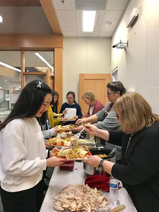 在课余时间里,同学们积极参与社团、conversation partner结交伙伴、听讲座、睡衣party、去农场、健身、游泳等丰富多彩的课外活动,充实自己的业余生活,营造良好的学习状态。除此之外,为帮助学生融入美国生活,西俄勒冈教大学育学院的老师们在感恩节期间,为我校50名赴美学习的学生亲自烹制美味的感恩节大餐,这活动更使他们了解丰富美国文化。