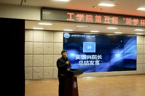 随后,工学院院长吴国兴老师总结发言。吴院长提出要重视和培养学生的创新意识和能力,通过工学院的筑梦杯比赛这个平台,锻炼学生们的能力,响应万众创新的国家氛围。