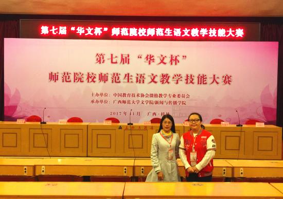 2017年11月26日上午,由中国教育技术协会微格教学专业委员会主办、广西师范大学新闻与传播学院承办的第七届“华文杯”师范院校师范生语文教学技能大赛隆重举行。中国教育技术协会微格教学专业委员会会长孟宪凯教授、秘书长杨广教授,以及来自全国各地几十所所师范院校的专家、学者、老师出席。我校教育学院副院长兼小学教育专业主任韩苏曼和教育学院办公室专任陈钰蓉两位老师带队,14级小学教育专业刘晓菁、马舒嘉、郑奥文、孙佳超、张萱五名选手参赛。